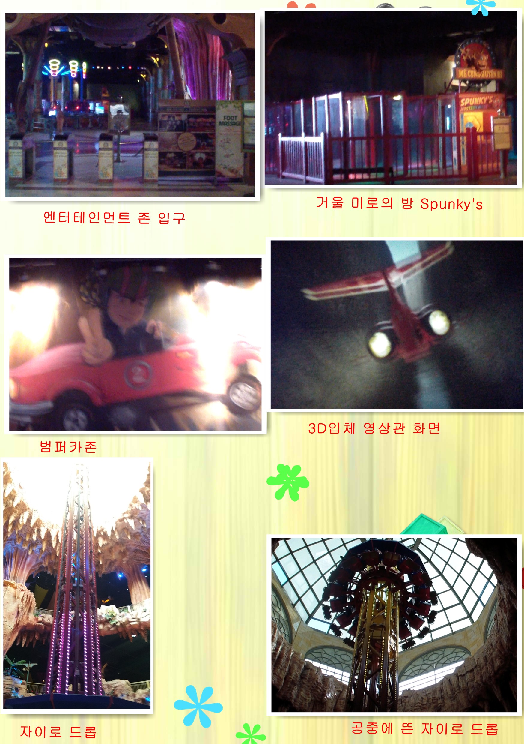 알파인코스터를 끝내고 실내에 놀이기구가 있는 엔터테인먼트 존으로 간다. 호화로운 조명 속에 많은 놀이기구들이 있는데 일부를 제외하고는 입장객들에게 무료이다. Spunky's 라고 써진 거울로 만들어진 미로의 방을 들어가 보고 그래도 어른이 탈만한 범퍼카를 타본다.