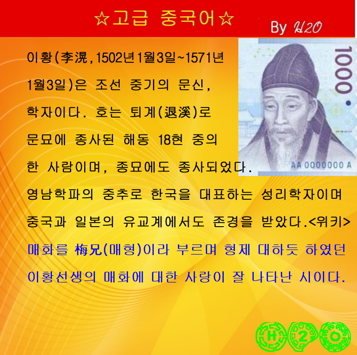 | 한시(漢詩)로 배우는 漢文과 중국어 502 ★陶山月夜詠梅 - 李滉-2 (0) | 2020.03.17 |