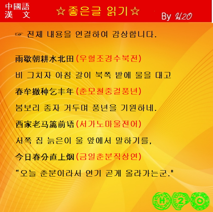 | 한시(漢詩)로 배우는 漢文과 중국어 504 ★田家卽事 - 申光洙-1 (0) | 2020.03.20 |
