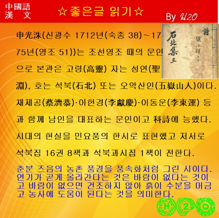 | 한시(漢詩)로 배우는 漢文과 중국어 505 ★田家卽事 - 申光洙-2 (0) | 2020.03.21 |