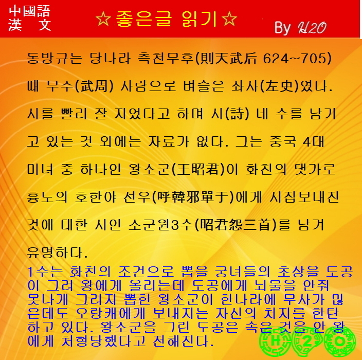 | 한시(漢詩)로 배우는 漢文과 중국어 526 ★ 昭君怨三首2 - 東方虯-1 (0) | 2020.04.29 |
