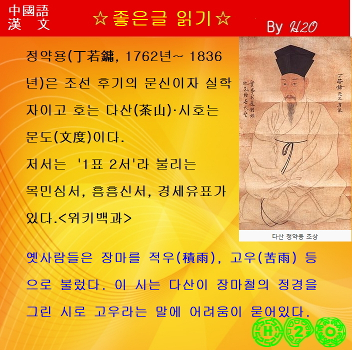 | 한시(漢詩)로 배우는 漢文과 중국어 570 ★苦雨行 - 丁若鏞-1 (0) | 2020.07.16 |