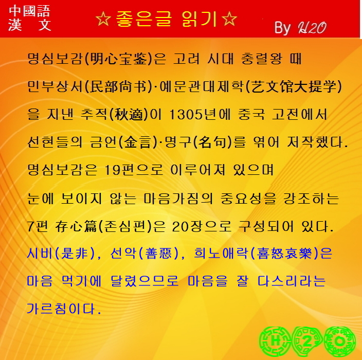 이번 강은 중국 고전에서 선현들의 금언(金言)·명구(名句)를 엮은 명심보감 7. 존심편입니다.