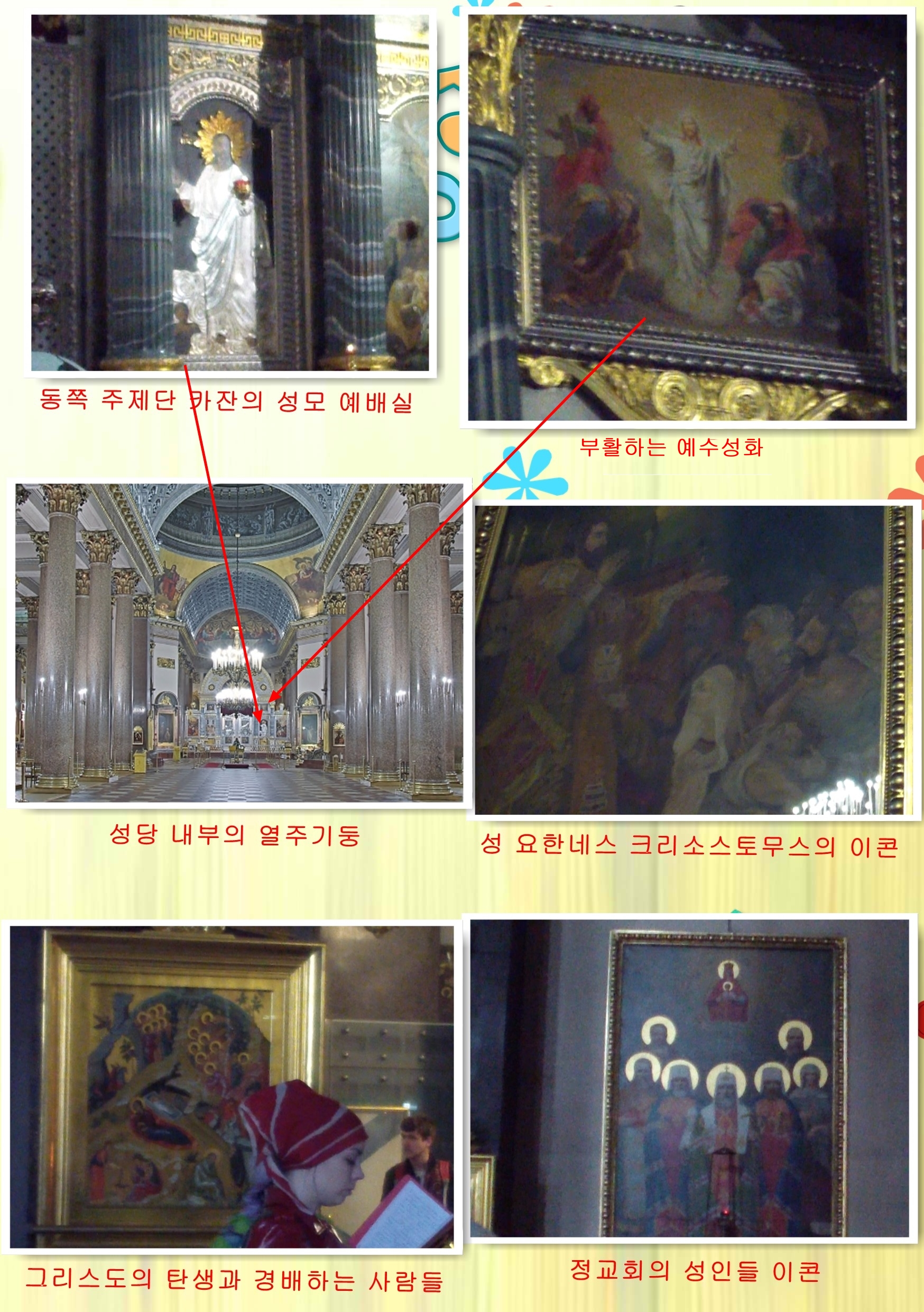 많은 이콘들의 주제가 성모 마리아이고 어떤 이콘 위에는 아칸서스 잎을 은세공 부조로 새겨 놓았다. 아칸서스는 코린트 양식의 기둥의 상단을 장식하는데 쓰이 듯이 서양에서 이런 저런 장식에 많이 사용된다. 이콘들과 함께 성화도 많이 있는데 성화에서 빨간 옷을 입었으면 그리스도 예수라고 보면 된다. 대부분 이콘이 벽에 걸려있지만 의자 받침대 위에 놓여있는 성모 이콘도 있다. 각각의 이콘에 대한 이름이나 세부사항을 알 수 없어서 그냥 천천히 돌아본다. 카잔의 성모 이콘 앞에는 신자들이 기도를 드리기 위해 줄을 서있다.