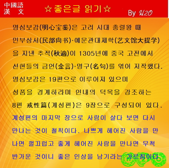 | 명문장으로 배우는 漢文과 중국어-767 明心寶鑑 8.戒性篇 10장 (0) | 2021.07.15 |