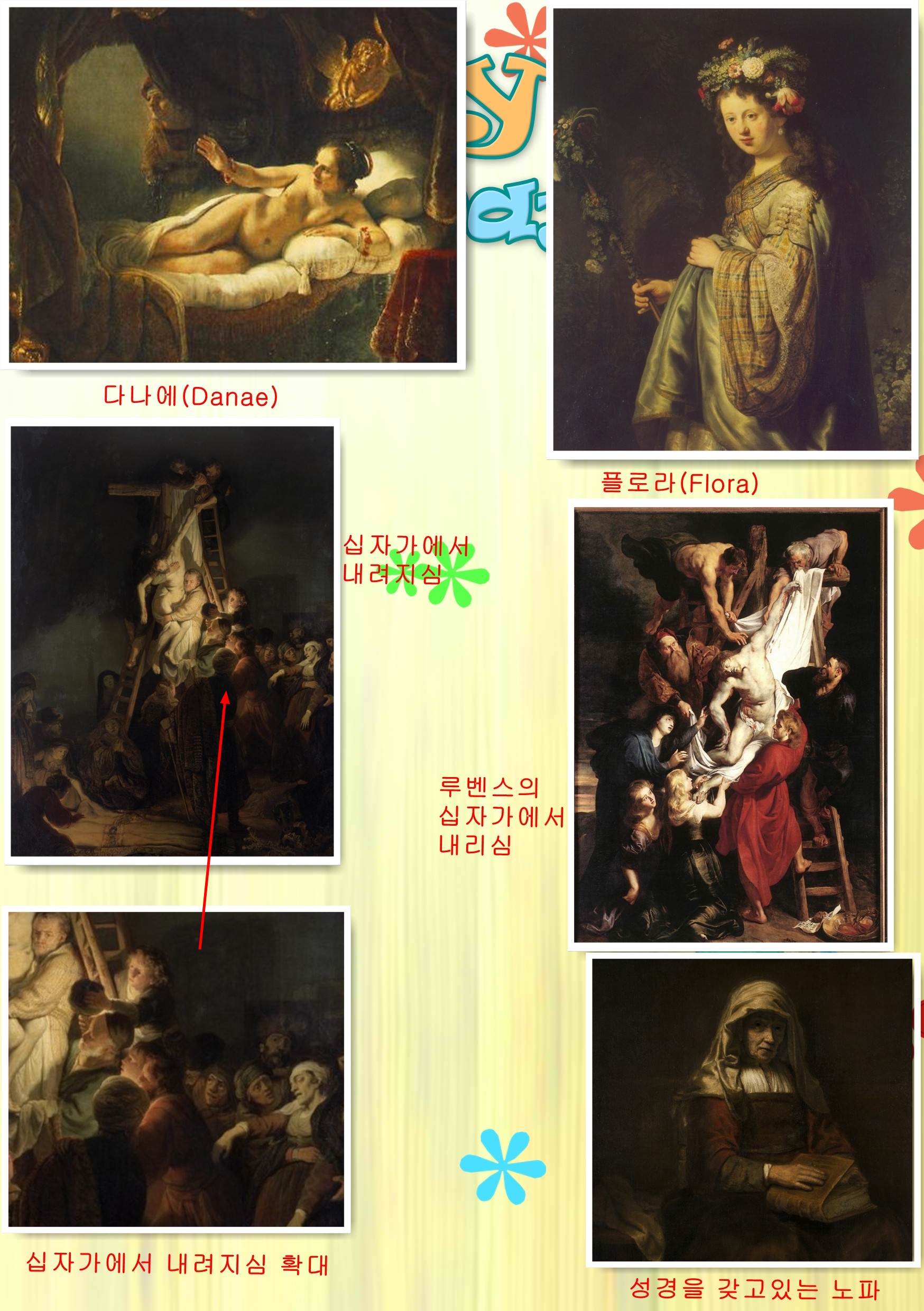 다음 그림은 렘브란트가 1634년에 그린 십자가에서 내려지심(Descent from the Cross)인데 루벤스의 작품을 보고 영감을 받아 빛과 어두움을 대비시켜 표현한 작품이다. 그리스도의 순결을 빛을 받은 하얀 몸으로 그렸는데 예수를 보물을 다루듯 내려앉는 남자는 아리마대 사람 요셉(Joseph of Arimathea)으로 그는 예수의 십자가형을 반대했던 의원이었고, 자기를 위해 준비했던 무덤을 예수에게 내주었던 부자였다. 요셉 아래서 예수를 떠받칠 준비를 하고 있는 흰 수염의 노인이 니고데모(Nicodemus)로 그는 바리새인이며 유대인의 관원이라고 요한복음 3장에 나오는데 예수를 만나 삶이 바뀌었다. 사다리 옆에 촛불을 밝혀 들고있는 소년이 ‘예수가 사랑한 제자’란 수식어가 붙는 요한(John)으로 요한이라는 이름의 뜻이 여호와의 사랑하는 자라고 한다. 요한을 그릴 때 모델로 쓴 이가 바로 렘브란트 자신이다. 렘브란트 자신이 그림 속에서 사건을 지켜보는 화자로 표현된 작품이다. 참,,, 예술가들이란~~~ 오른쪽으로 아래로 사람들의 부축을 받고 있는