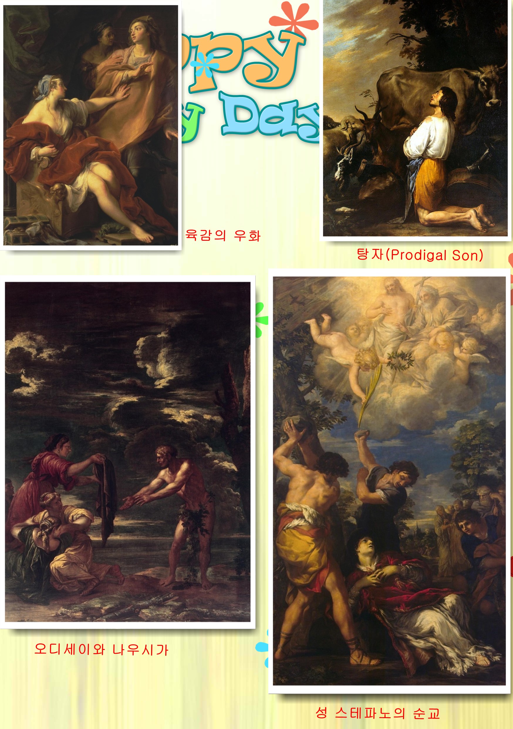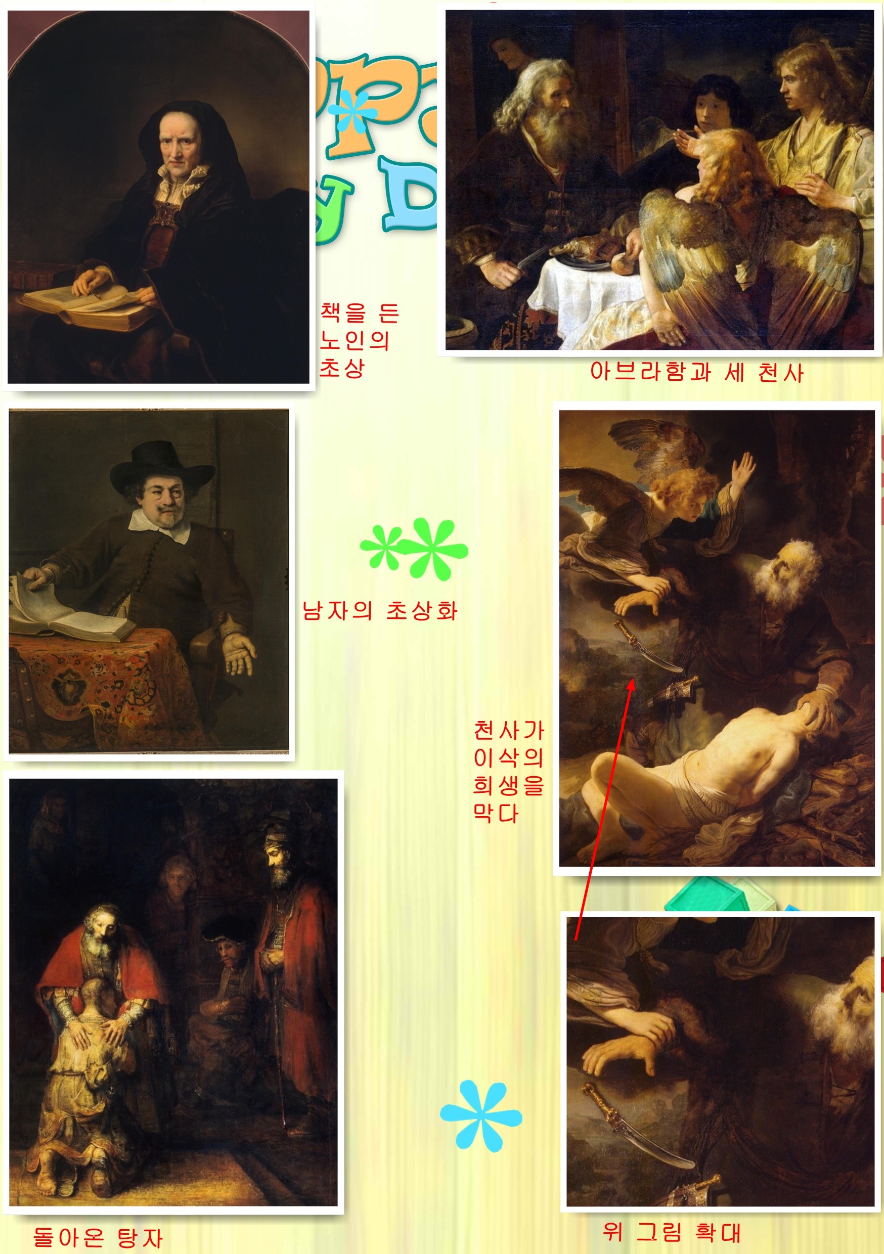 렘브란트는 1642년 많은 지참금을 갖고 시집와서 도움을 주던 첫 아내인 사스키아(Saskia van Uylenburch)가 죽고 1662년 작품세계에 도움을 주던 둘째 아내 헨드리키에(Handrickje Stoffels)도 죽고 68년 아들 티투스(Titus)마저 죽는다. 파산까지 하며 어려운 생활 중에 예술활동을 이어가 빛과 어둠의 마술사라는 별명을 얻는다. 그가 사망한 1669년 2년 이내에 그려진 것으로 추정되는 돌아온 탕자(Return of the Prodigal Son)를 본다. 아들을 잡은 아버지의 왼손은 남자 손이고 오른손은 여자의 손으로 표현되었는데 아버지면서 동시에 어머니의 손으로 신의 양성적인 사랑을 표현했다고 한다. 탕자의 아무렇게나 깍은 머리, 남루한 옷, 벗겨진 샌들과 부르튼 발은 신을 떠난 영혼의 고통을 의미한다. 우측에 붉은 망토를 입고 두사람을 차갑게 바라보고 있는 사람은 이 집의 큰아들인데 재산의 반을 탕진하고 돌아온 동생을 형은 어떻게 생각하고 있을까? 그림 뒤쪽으로 가슴에 손을 얹고 안타까운 눈으로 바라보는 하녀의 모습도 보인다. 탕자의 오른쪽으로 칼을 차고있는데 이 집 아들이라는 신분의 표시로 칼만은 지킨 것이며 그의 마지막 남은 자신의 표지는 아무리 어려워도 처리하지 못했던 것이다. 바로크 시대의 네덜란드 화가 렘브란트의 세계 최고의 성화로 평가된다.