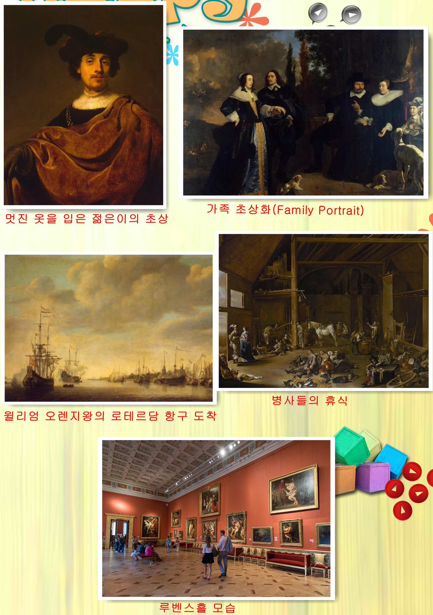 그 우측에 멋진 옷을 입은 젊은이의 초상Portrait of a Young Man in a Fancy Dress)이 걸려있는데 야코프 아드리안스 바커르 (Backer, Jacob Adriaensz 1608-1651)의 1640년대 작품이다. 우측에 다섯 사람과 강아지 한 마리가 있는 그림은 가족 초상화(Family Portrait)라는 그림이다. 홀랜드 화가인 바르톨로메우스 반 데르 헬스트(Helst, Bartholomeus van der 1612~1670)의 1647년 작품이다.