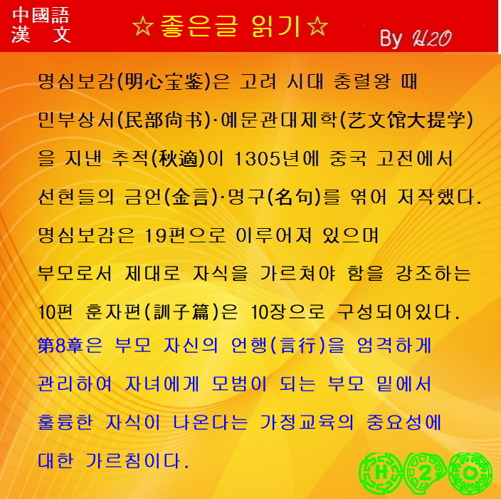 이번 강은 중국 고전에서 선현들의 금언(金言)·명구(名句)를 엮은 명심보감 10. 훈자편입니다.