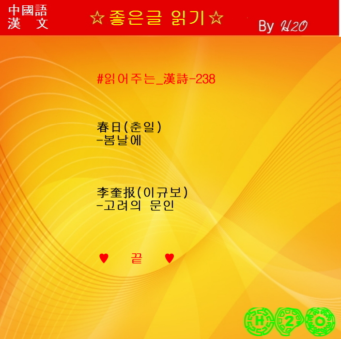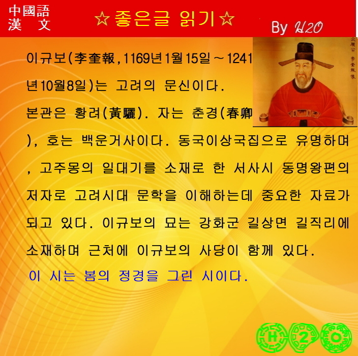 | 한시(漢詩)로 배우는 漢文과 중국어 - 906 ★春日 - 李奎報-2 (0) | 2022.04.01 |