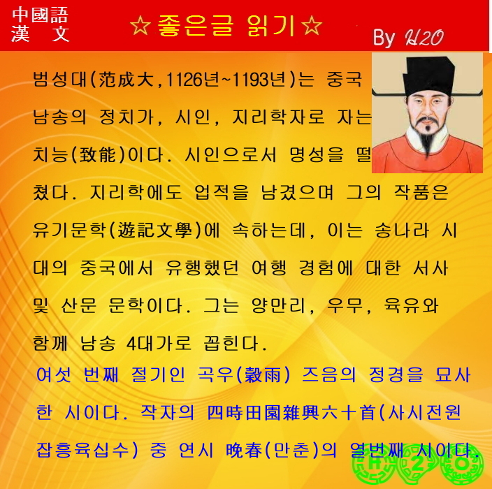 #914강 한시(漢詩)로 배우는 漢文과 중국어 ★晩春 其十 - 范成大-1