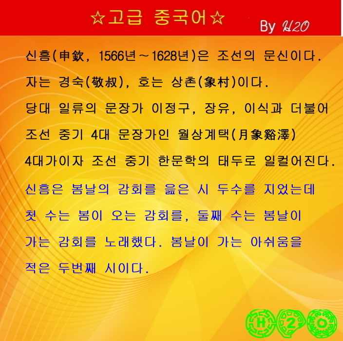 | 한시(漢詩)로 배우는 漢文과 중국어 - 928 ★感春 基二 - 申欽-2 (0) | 2022.05.13 |