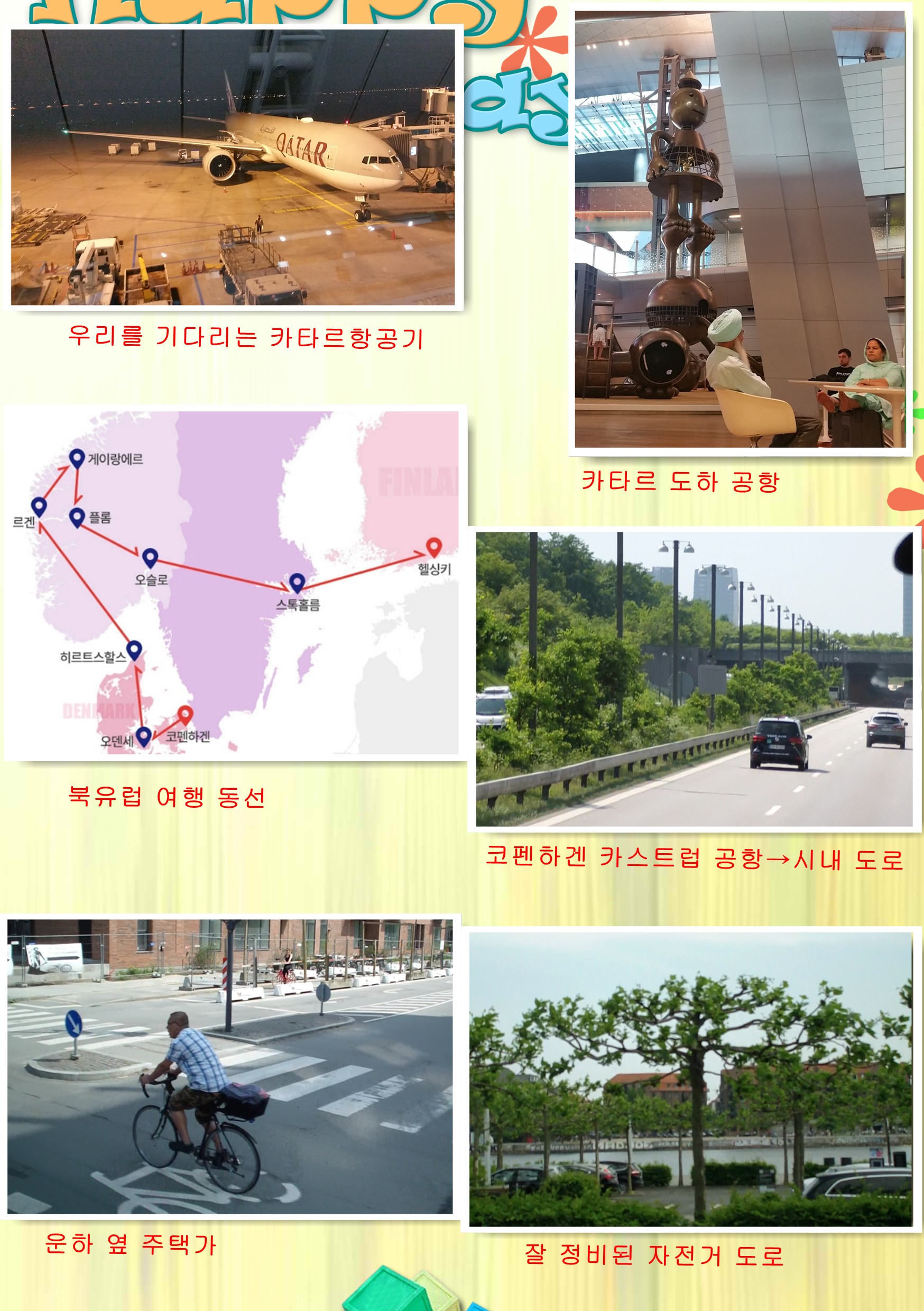카타르항공을 이용하는 여정이어서 카타르 수도인 도하까지 가고 공항에서 쉬다가 환승하여 코펜하겐으로 이동한다. 밤 10시에 가이드 미팅 후에 12시 45분 인천공항을 떠나 도하까지 10시간 20분을 비행하여 05:00시 공항에 도착하니 이슬람 사람이 먼저 보인다. 도하 공항에서 3시간을 대기 후 환승하여 8시 20분 도하를 떠나 코펜하겐으로 간다. 6시간을 더 비행하여 14:25에 도착한다. 그래서 바로 관광을 시작한다.