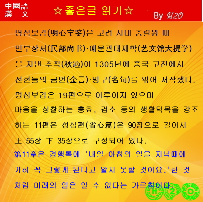 | 명문장으로 배우는 漢文과 중국어-987 明心寶鑑 11.省心篇 上 11장 (0) | 2022.09.05 |