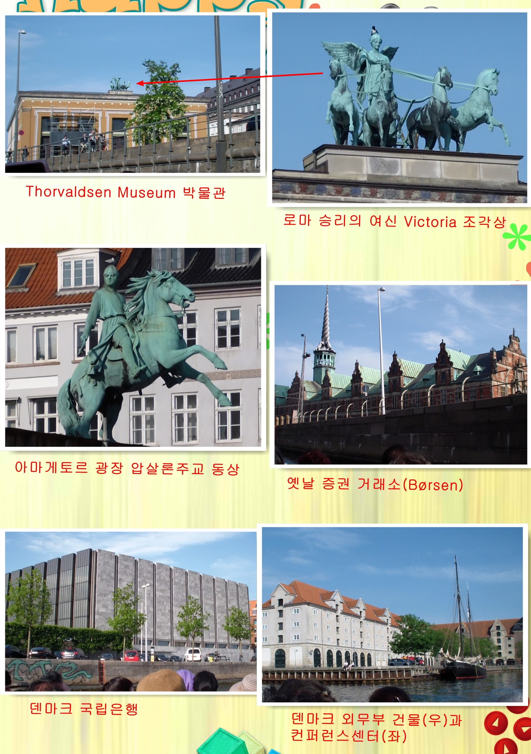 궁 옆에 덴마크 신고전주의 조각가 Bertel horvaldsen의 예술에 헌정된 트로발센 박물관(Thorvaldsen Museum)이 있다. 지붕에는 네마리의 말이 끄는 로마 승리의 여신 빅토리아(Victoria)의 조각상이 있다. 400년이 넘은 운하의 벽을 옆에 끼고 유람선은 조용히 미끌어진다. 크리스티안스보르 성 근처 아마게토르 광장(Amagertorv Square)에 압살롬주교 동상이 있고 그 뒤로 성 니콜라스를 모시는 니콜라스교회 첨탑이 보인다.