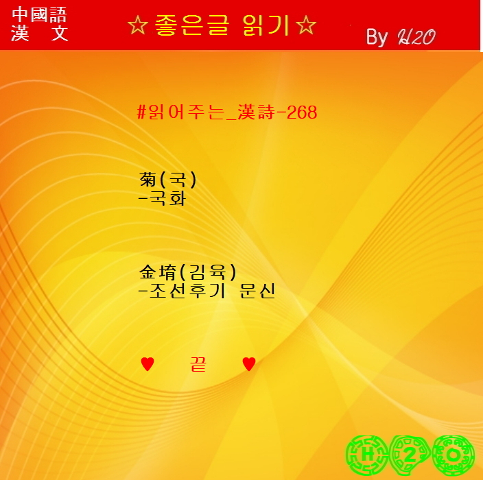 | 한시(漢詩)로 배우는 漢文과 중국어 - 1014 ★菊 - 金堉-2 (0) | 2022.10.28 |