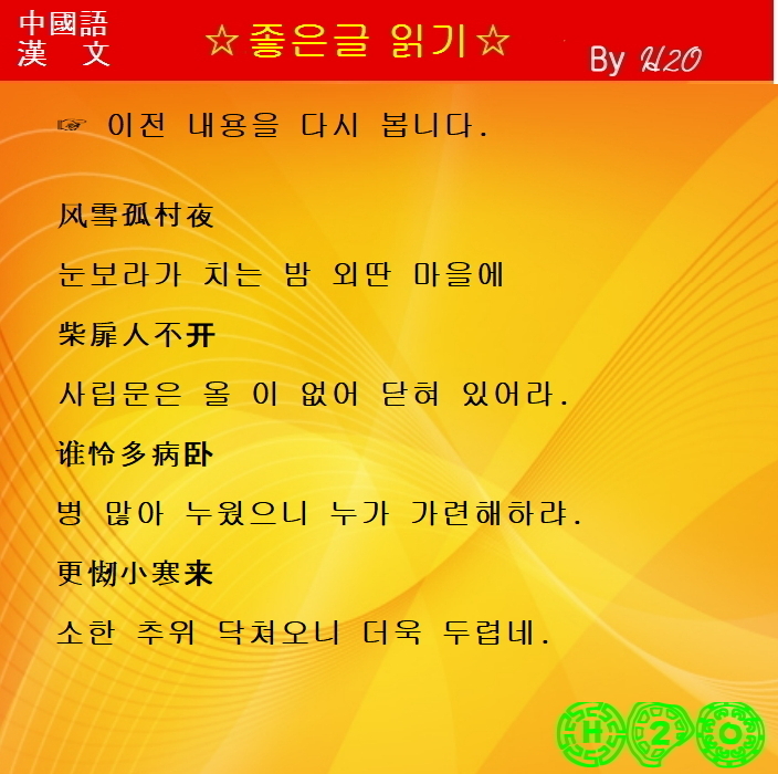 | 한시(漢詩)로 배우는 漢文과 중국어 - 1059 ★雪夜 - 曺文秀-4 (0) | 2023.01.20 |