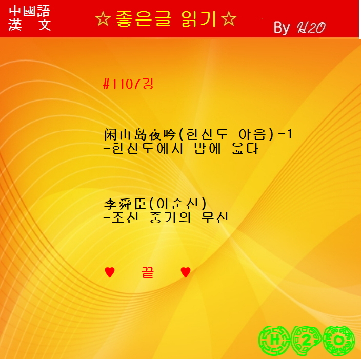 | #읽어주는_漢詩-294 ★閑山島夜吟 - 李舜臣 (2) | 2023.04.29 |