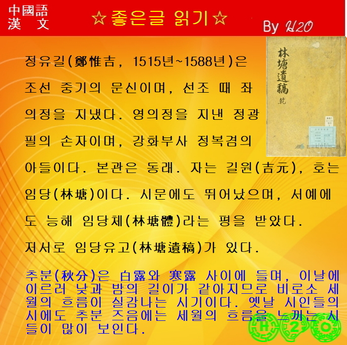 | #읽어주는_漢詩-315 ★書寄尹梧陰別墅 - 鄭惟吉 (0) | 2023.09.23 |