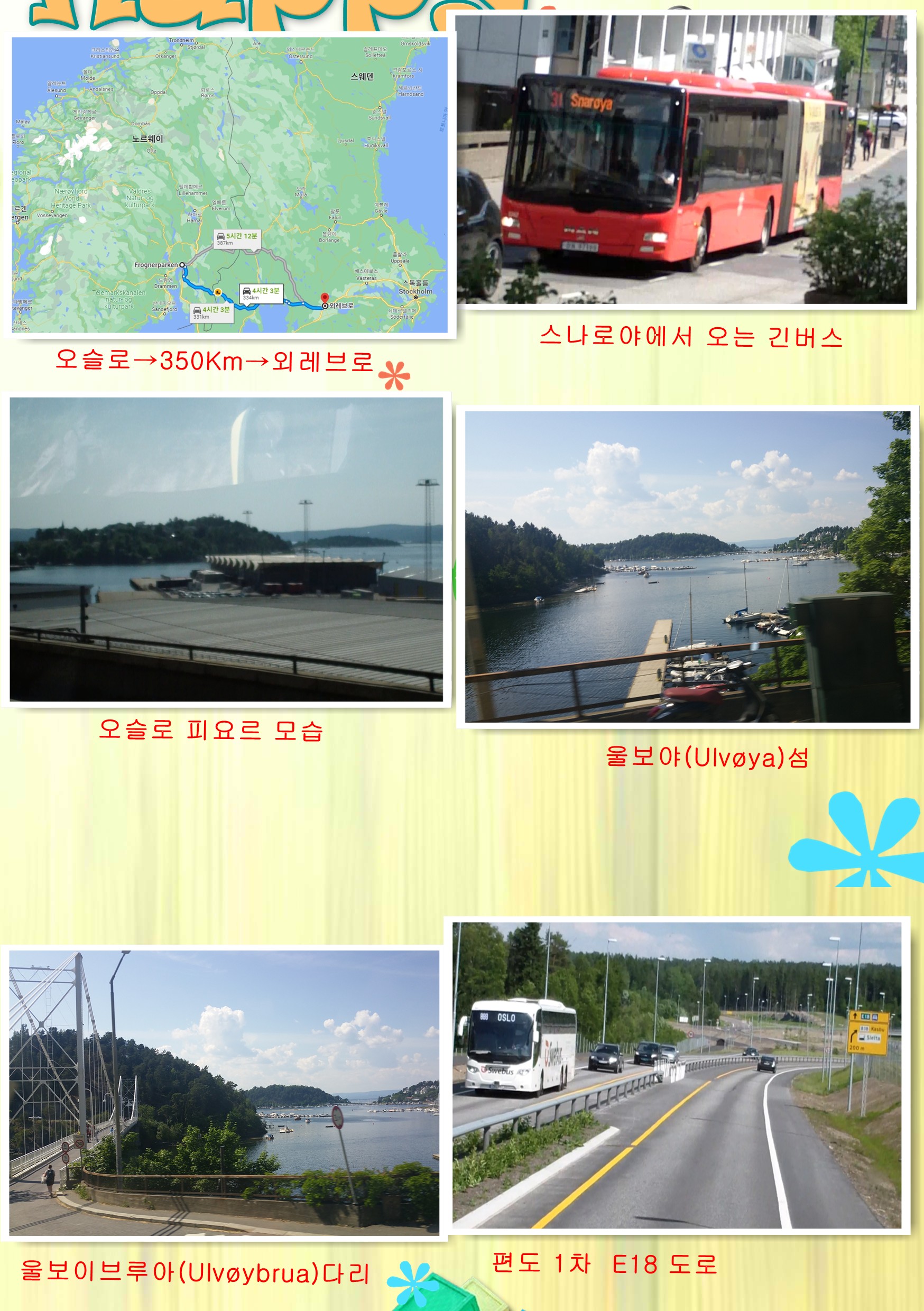 13:30 공원을 떠나 다음 목적지인 오늘 호텔이 있는 스웨덴의 외레브로(Orebro)로 이동한다. 350Km가 넘어서 6시간 넘게 걸린다. 오슬로를 벗어나는데 시내버스 두대를 연결한 긴 버스가 다닌다. 뒤에 오는 버스 번호 표지판을 보니 스나로야(Snaroya)에서 오는데 오슬로 피요르드에 있는 마을이다.