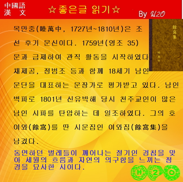 | #읽어주는_漢詩-342 ★驚蟄日雨坐 - 睦萬中 (16) | 2024.03.16 |