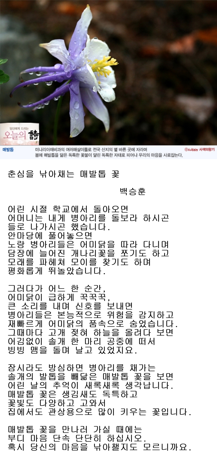 춘심을 낚아채는 매발톱 꽃 - 백승훈