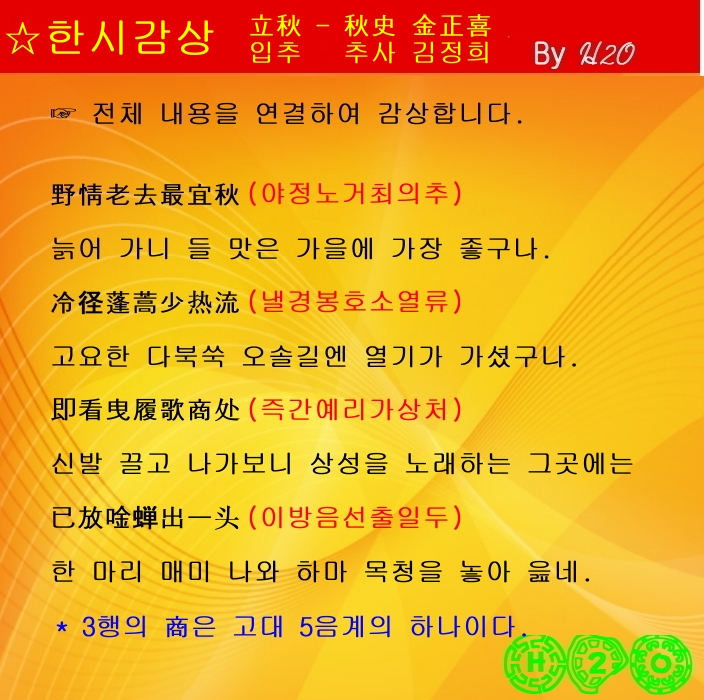 | 한시(漢詩)로 배우는 漢文과 중국어 - 1348 ★立秋 - 金正喜 - 2 (0) | 2024.08.06 |
