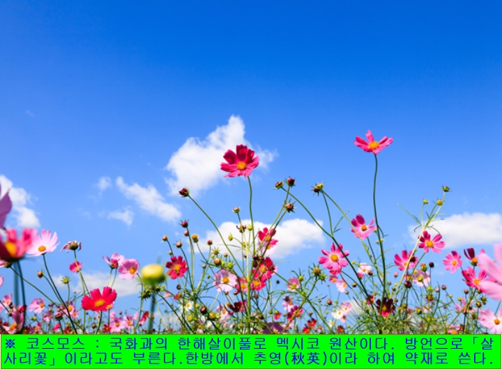 ※ 코스모스 : 국화과의 한해살이풀로 멕시코 원산이다. 방언으로「살사리꽃」이라고도 부르는데 우리나라 각처의 들과 길가에 자생한다. 잎은 마주나는데 2회 깃꼴로 갈라지는 겹잎으로 갈래는 선형이다. 6~10월에 흰색, 연분홍, 분홍, 연한 붉은색, 진홍색 등의 꽃이 피고, 9~10월에 열매가 바늘 모양으로 익는다. 한방에서「추영(秋英)」이라 하여 지상부(地上部)의 전초(全草)를 약재로 쓴다.