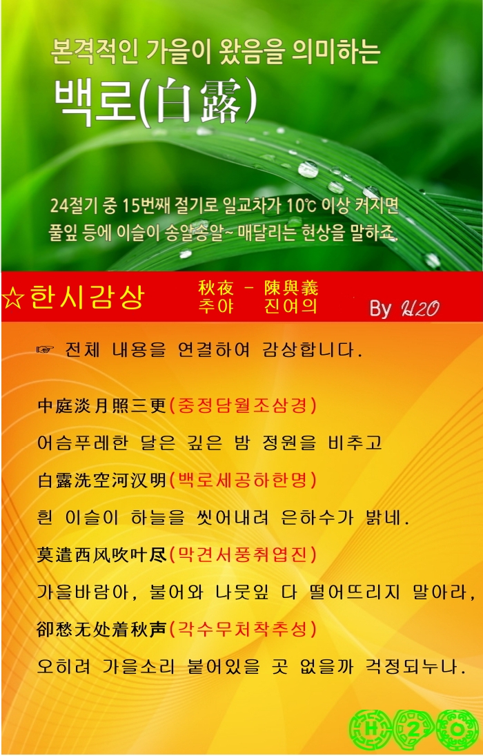 | 한시(漢詩)로 배우는 漢文과 중국어 - 1364 ★秋夜 - 陳與義 - 1 (1) | 2024.09.05 |