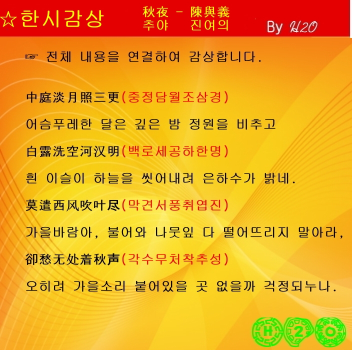 | 한시(漢詩)로 배우는 漢文과 중국어 - 1365 ★秋夜 - 陳與義 - 2 (0) | 2024.09.06 |
