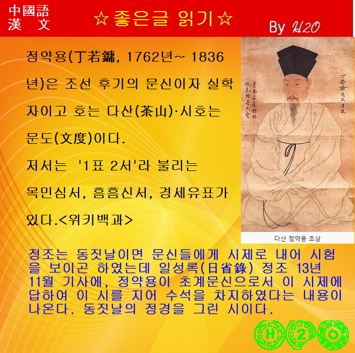 | #읽어주는_漢詩-383 ★內閣應敎-冬至 2 - 丁若鏞 (0) | 2024.12.28 |
