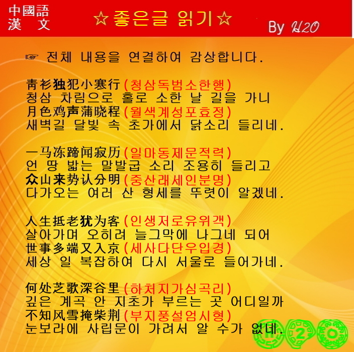 | 한시(漢詩)로 배우는 漢文과 중국어 - 1431 ★小寒馬上 - 申光洙 - 4 (0) | 2025.01.10 |