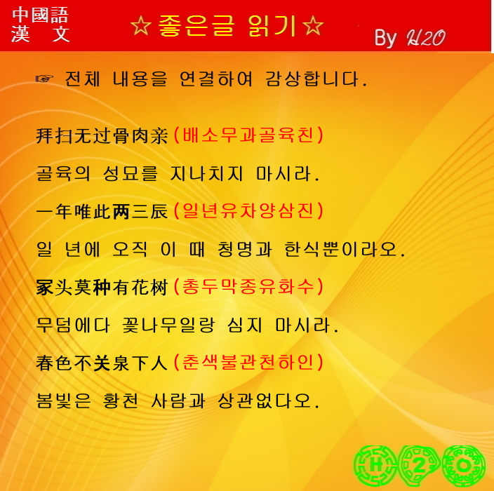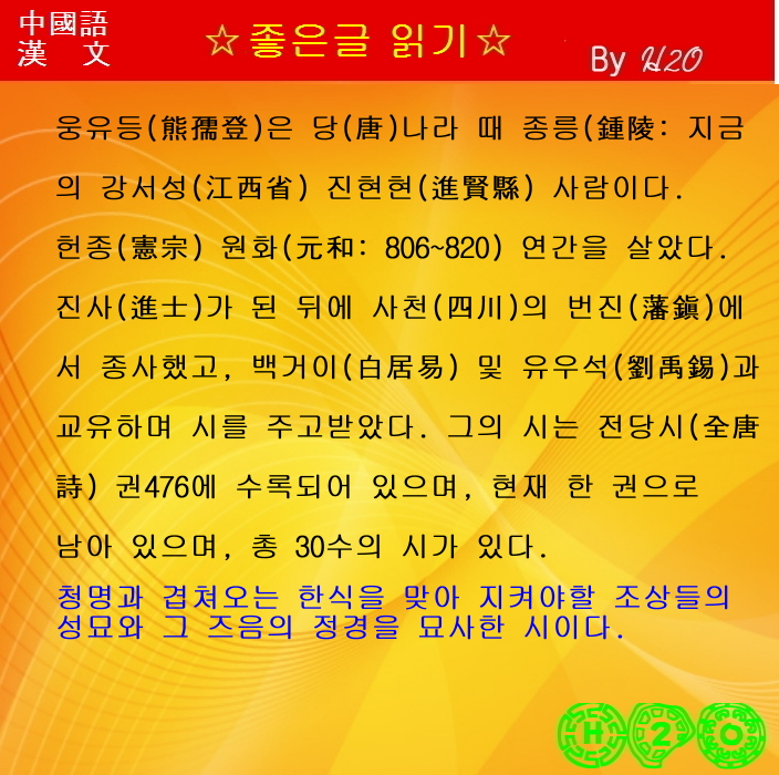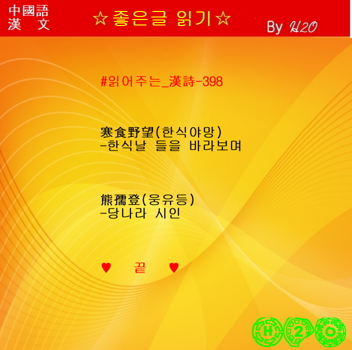 | 한시(漢詩)로 배우는 漢文과 중국어 - 1477 ★寒食野望 - 熊孺登 - 2 (2) | 2025.04.04 |