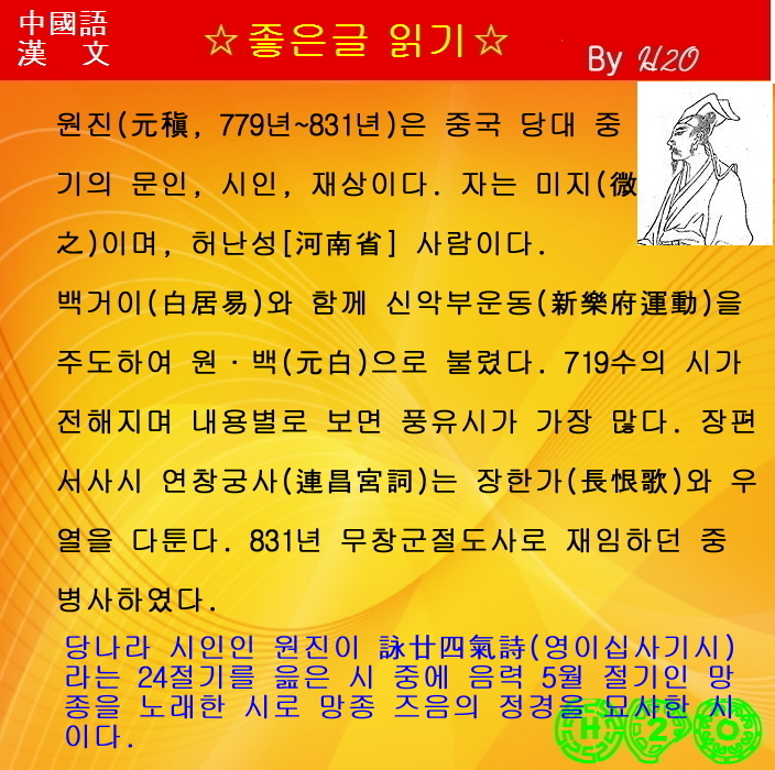 | 한시(漢詩)로 배우는 漢文과 중국어 - 1511 ★芒種五月節 - 元稹 - 3 (0) | 2025.06.12 |