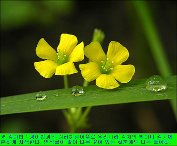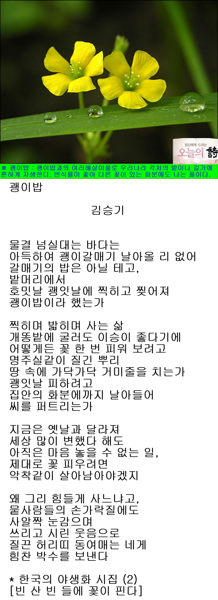 ※ 괭이밥 : 괭이밥과의 여러해살이풀로 우리나라 각처의 밭이나 길가에 흔하게 자생한다. 전체에 잔털이 퍼져나고, 줄기는 땅을 기거나 비스듬히 올라가며, 가지가 많이 갈라진다. 잎은 어긋나는데 잎자루가 길고, 3출겹잎이다. 작은잎은 하트 모양의 심장형으로 가장자리가 밋밋하고, 밤이나 햇살이 없는 흐린 날에는 가운데 중심선을 따라 반으로 접혀진다. 3~10월에 잎겨드랑이에서 나온 꽃줄기 끝에 노란색의 꽃이 피고, 5~10월에 6각으로 된 원기둥 모양의 열매가 갈색으로 익는데 껍질이 터지면서 많은 씨가 튀어나간다. 뿌리줄기에 옥실산이 들어 있어 풀 전체에서 새콤한 신맛이 나고, 어린잎은 식용하며, 한방에서「초장초(酢漿草)」라 하여 지상부(地上部)의 전초(全草)를 약재로 쓴다. 어울리지 않게 고양이의 밥이라는 이름이 붙여졌는데 번식률이 대단하여 집안의 다른 꽃이 있는 화분 등에도 흔히 나는 풀이다.