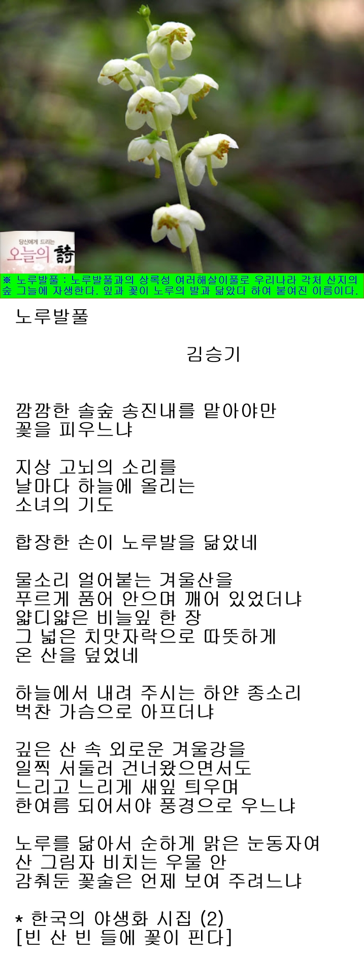 ※ 노루발풀 : 노루발풀과의 상록성 여러해살이풀로 우리나라 각처 산지의 숲 그늘에 자생한다. 잎은 밑동에서 모여나는데 둥근 모양 또는 넓은 타원형으로 끝이 뭉툭하고, 밑동이 둥글며, 잎자루가 길고 두껍다. 윗면은 녹색이고 뒷면은 더러 자색을 띤다. 잎맥을 따라 무늬가 있고 가장자리에 얕은 톱니가 있다. 6~7월에 황백색의 꽃이 피는데 꽃줄기는 곧추서는데 비늘잎으로 싸여 있으며, 긴 암술대가 꽃잎 밖으로 벋는다. 9월에 납작하고 둥근 모양의 열매가 5갈래로 갈라지면서 갈색으로 익는다. 한방에서「녹수초(鹿壽草)」또는「녹제초(鹿蹄草)」라 하여 지상부(地上部)의 전초(全草)를 약재로 쓴다. 잎이 노루의 발과 닮았다 하여 붙여진 이름이다.