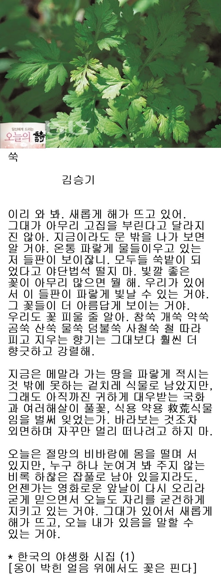 그대가 아무리 고집을 부린다고 달라지진 않아. 지금이라도 문 밖을 나가 보면 알 거야. 온통 파랗게 물들이우고 있는 저 들판이 보이잖니. 모두들 쑥밭이 되었다고 야단법석 떨지 마. 빛깔 좋은 꽃이 아무리 많으면 뭘 해. 우리가 있어서 이 들판이 파랗게 빛날 수 있는 거야. 그 꽃들이 더 아름답게 보이는 거야. 우리도 꽃 피울 줄 알아. 참쑥 개쑥 약쑥 곰쑥 산쑥 물쑥 덤불쑥 사철쑥 철 따라 피고 지우는 향기는 그대보다 훨씬 더 향긋하고 강렬해.