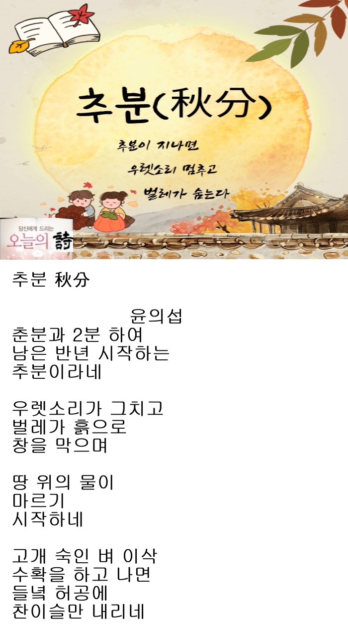 추분 秋分 / 윤의섭 춘분과 2분 하여 남은 반년 시작하는 추분이라네 우렛소리가 그치고 벌레가 흙으로 창을 막으며 땅 위의 물이 마르기 시작하네 고개 숙인 벼 이삭 수확을 하고 나면 들녘 허공에 찬이슬만 내리네