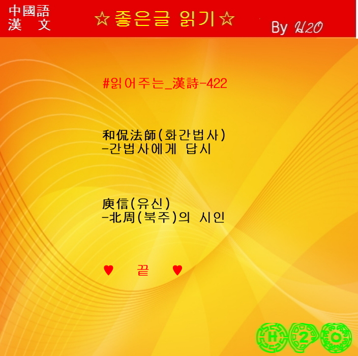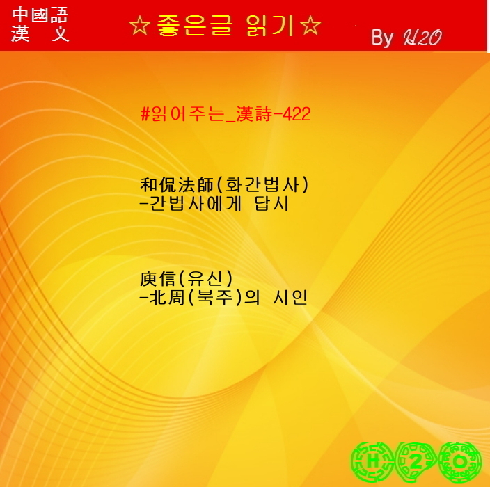 和侃法師(화간법사)... 北周(북주)에 사사하고 있을 때 만든 詩(시). 법사가 남쪽으로 돌아갈 때 지은 시에 화답하는 시. 侃法師(간법사)는 친구. 남방 사람.