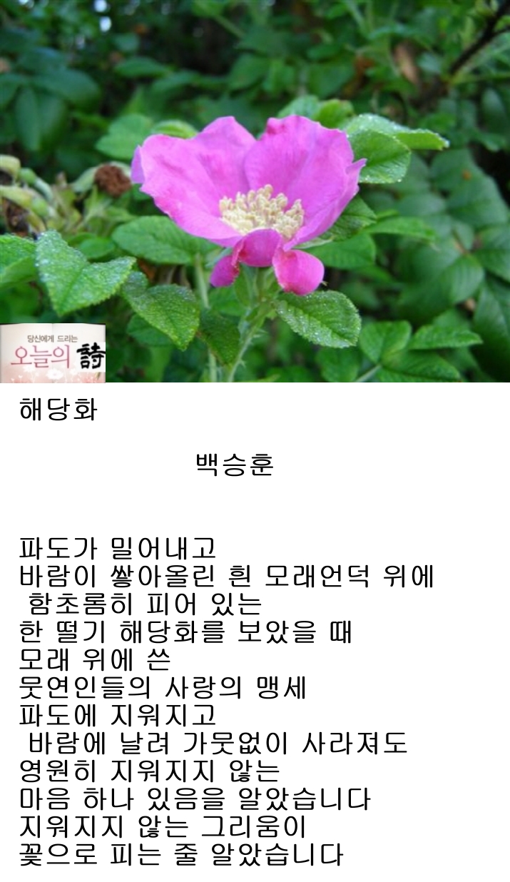 *해당화 : 장미과에 속하는 낙엽관목으로 우리나라 각처의 바닷가 모래땅과 산지에서 자란다.