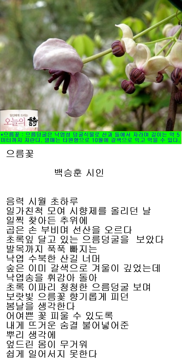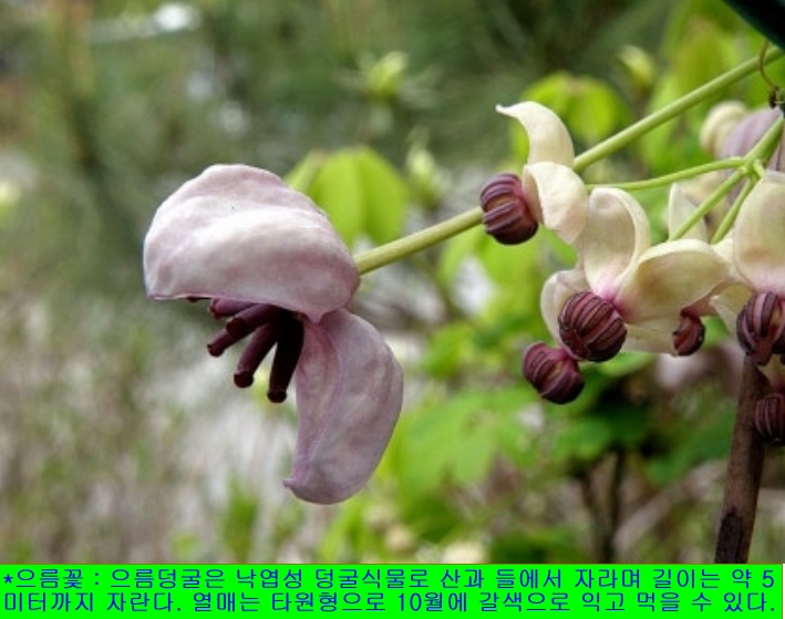 *으름꽃 : 으름덩굴은 낙엽성 덩굴식물로 산과 들에서 자라며 길이는 약 5미터까지 자란다.