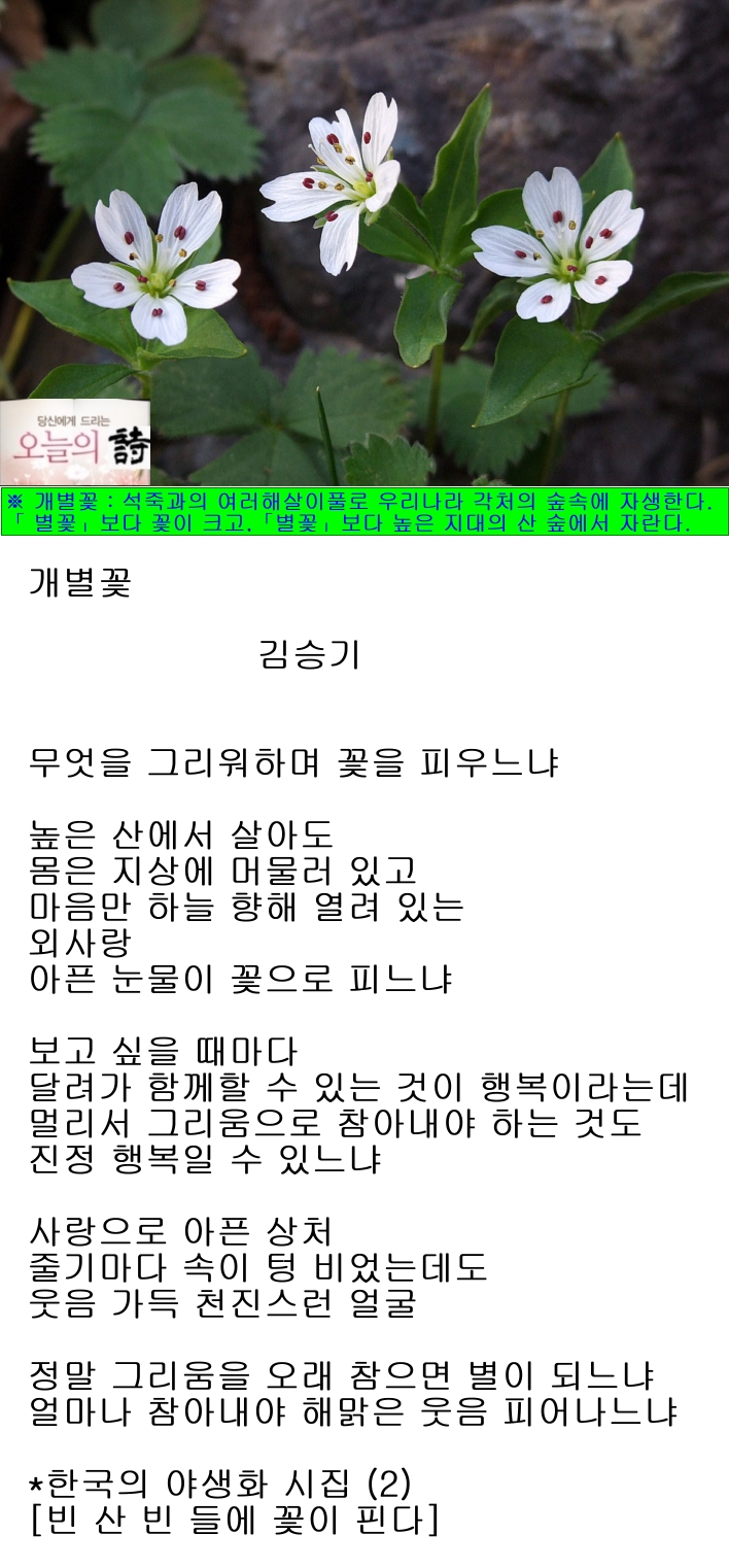 ※ 개별꽃 : 석죽과의 여러해살이풀로 우리나라 각처의 숲속에 자생한다. 뿌리에 고구마 모양의 덩이줄기가 1~2개씩 붙고, 줄기는 1~2개씩 나오며, 흰 털이 나있다. 잎은 마주나는데 피침형으로 아래쪽 잎은 좁아져서 잎자루 모양이 된다. 4~5월에 흰색의 꽃이 잎겨드랑이에서 한 송이씩 피고, 6~7월에 둥근 계란형의 열매가 갈색으로 익는데 3갈래로 갈라지며 씨앗이 나온다. 어린순을 식용하고, 한방에서 뿌리껍질을「태자삼(太子蔘)」이라 하여 약재로 쓴다.「별꽃」보다 꽃이 크고,「별꽃」보다 높은 지대의 산 숲에서 자란다.