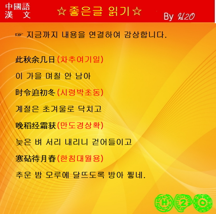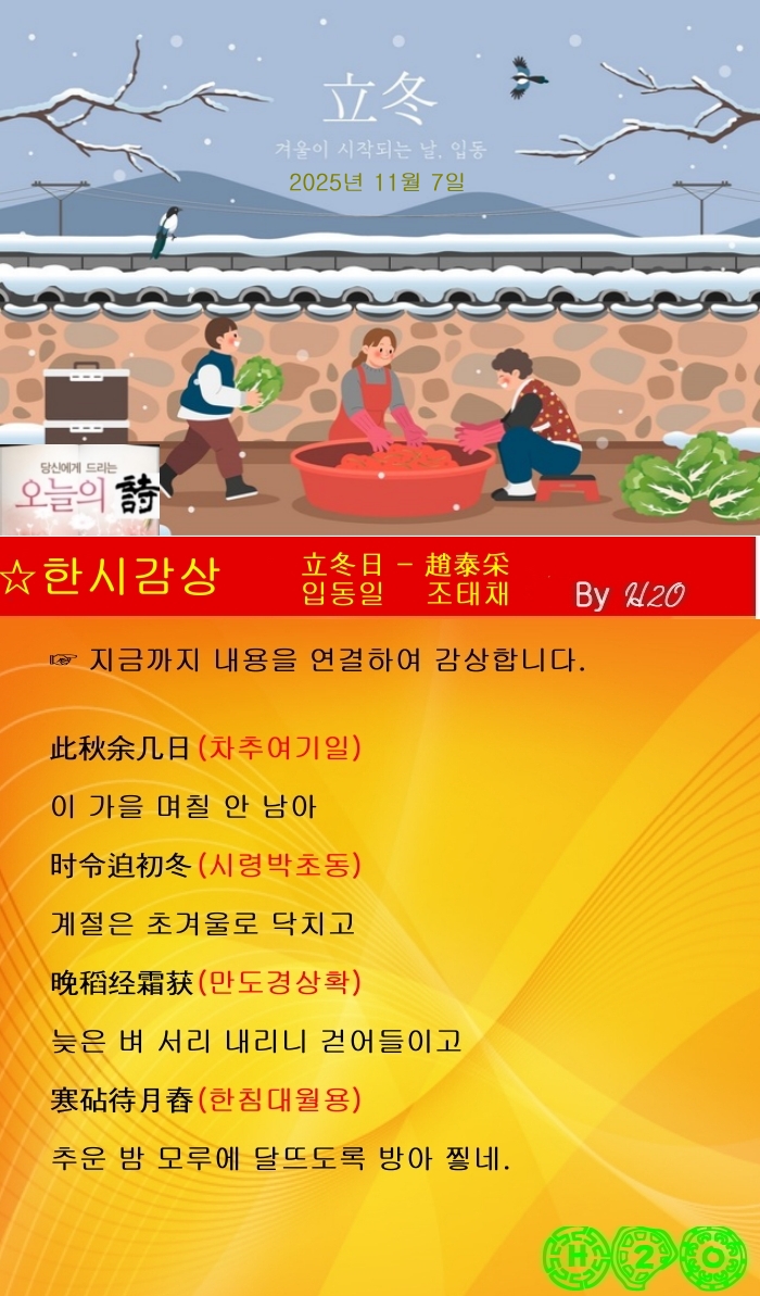 | 한시(漢詩)로 배우는 漢文과 중국어 - 1590 ★立冬日 - 趙泰采 - 2 (0) | 2025.11.07 |