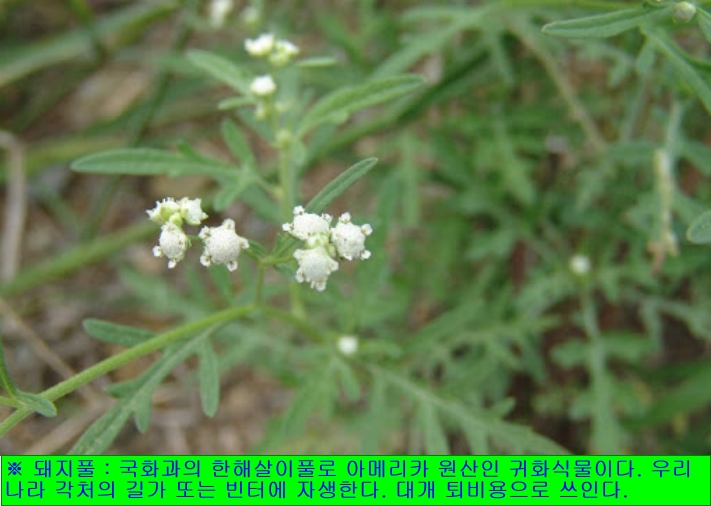 ※ 돼지풀 : 국화과의 한해살이풀로 아메리카 원산인 귀화식물이다. 우리나라 각처의 길가 또는 빈터에 자생한다. 전체에 솜털이 많고, 잎은 마주나거나 어긋나는데 깃꼴겹잎으로 쑥잎과 같은 모양이다. 8~9월에 연한 황록색의 꽃이 피는데 통꽃으로 된 단성화로서 수꽃은 가지 끝에 이삭 모양으로 피고 암꽃은 수꽃 밑의 겨드랑이에 붙는다. 9~10월에 열매가 좁은 타원형으로 익는다. 대개 퇴비용으로 쓰이며, 꽃가루가 호흡기 질병 또는 눈병 등의 알레르기를 유발시키는 쓸모없는 잡초이다.