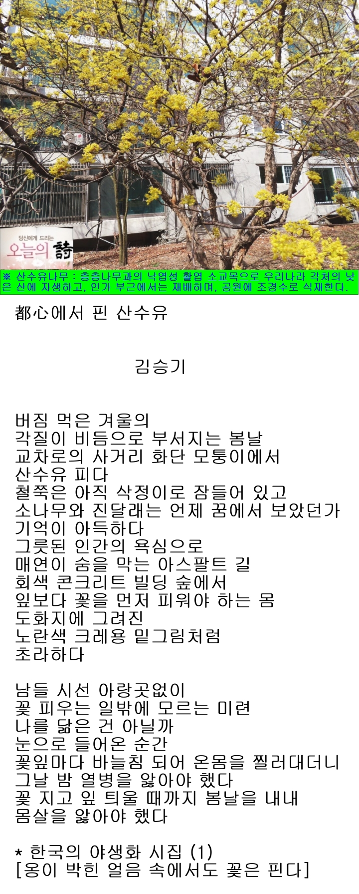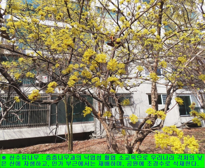 ※ 산수유나무 : 층층나무과의 낙엽성 활엽 소교목으로 우리나라 각처의 낮은 산에 자생하고, 인가 부근에서는 재배하며, 공원에 조경수로 식재한다. 나무껍질은 갈색이며 비늘조각처럼 벗겨지고, 잎은 마주나는데 계란형으로 끝이 길게 뾰족하며, 가장자리는 밋밋하다. 3~4월에 노란색의 꽃이 잎보다 먼저 피고, 8~10월에 타원형의 열매가 붉은색으로 익는데 광택이 나며, 맛이 시기도 하고 떫기도 하다. 열매를 식용하고 음료용으로 쓰며, 한방에서「산수유(山茱萸)」라 하여 열매의 과육(果肉)을 약재로 쓴다. 공해가 심한 도심에서도 잘 자라는 식물이다.