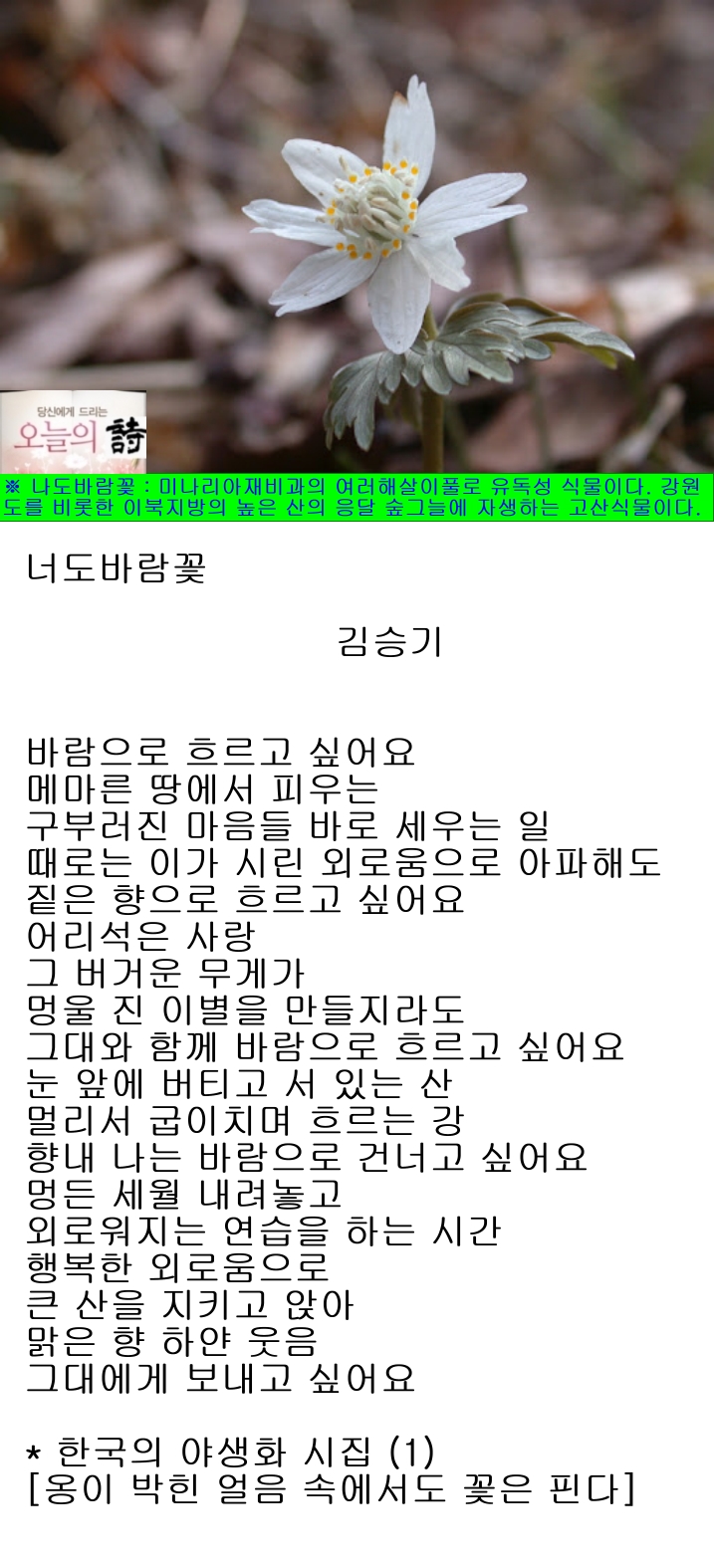 ※ 나도바람꽃 : 미나리아재비과의 여러해살이풀로 유독성 식물이다. 우리나라 강원도를 비롯한 이북지방의 백두대간 높은 산의 응달진 숲그늘에 자생하는 고산식물이다. 뿌리줄기는 짧고, 줄기는 곧게 선다. 잎은 줄기 중앙에 한 장이 달리는데 3장의 작은 잎으로 된 겹잎으로 잎자루가 길다. 작은잎도 잎자루가 있으며, 다시 3갈래로 깊게 갈라지고, 갈래에 결각상으로 된 톱니가 있다. 4~6월에 흰색의 꽃이 피는데 꽃줄기 끝의 잎 모양으로 생긴 총포 위에 모여 달린다. 7~9월에 타원형의 열매가 별처럼 갈라진 모양으로 익는다.