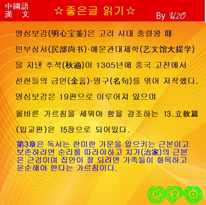 | 명문장으로 배우는 漢文과 중국어-1595 明心寶鑑 12.立敎篇 - 第3章-1 (0) | 2025.11.17 |