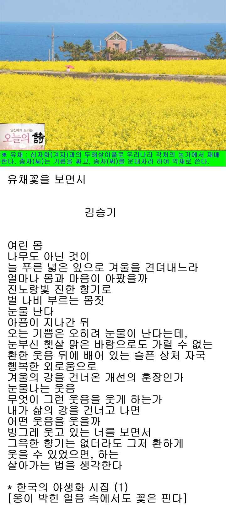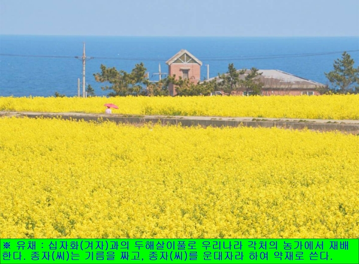 ※ 유채 : 십자화(겨자)과의 두해살이풀로 우리나라 각처의 농가에서 재배한다. 줄기는 빽빽하게 모여나고 곧게 선다. 뿌리에서 나오는 잎은 모여나는데 가장자리에 불규칙한 톱니가 있고, 줄기에서 나오는 잎은 잎자루가 있으며, 다소 깃 모 양으로 갈라지고, 가장자리에 이 모양의 톱니가 있다. 잎의 표면은 진한 녹색을 띠고, 뒷면은 분백색이며, 잎자루는 자줏빛이 돌고, 원줄기를 감싼다. 3~4월에 노란색의 꽃이 피고, 6월에 원기둥 모양의 열매가 갈색으로 익는데 검은 갈색의 씨가 들어있다. 향과 꿀이 많아 벌 나비가 많이 찾는 꽃으로 우리의 중요한 채소의 하나이며, 종자(씨)는 기름을 짜고, 한방에서 어린잎을「운대(蕓薹)」라 하고, 종자(씨)를「운대자(蕓薹子)」라 하여 약재로 쓴다.