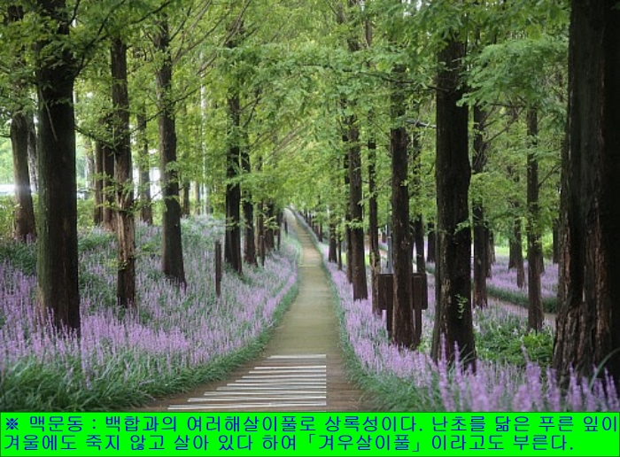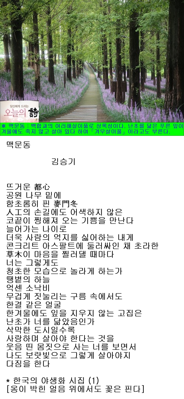 ※ 맥문동 : 백합과의 여러해살이풀로 상록성이다. 우리나라 각처 산과 들의 그늘진 곳에 자생한다. 뿌리줄기는 짧고, 끝이 커져 땅콩처럼 되며, 수염뿌리가 달린다. 잎은 뿌리줄기에서 모여나와 포기를 이루는데 선형으로 납작하며 끝이 뭉툭하다. 5~8월에 보라색 또는 연한 자주색의 꽃이 피고, 10~11월에 둥근 모양의 열매가 검은색으로 익는다. 한방에서「맥문동(麥門冬)」이라 하여「개맥문동」과 함께 덩이뿌리를 약재로 쓴다.「소엽맥문동(小葉麥門冬)」과「맥문아재비」는 약재로 쓰지 않는다. 난초를 닮은 푸른 잎이 겨울에도 죽지 않고 살아 있다 하여「겨우살이풀」이라고도 부른다.