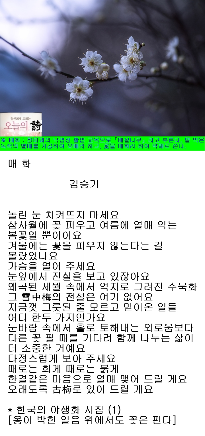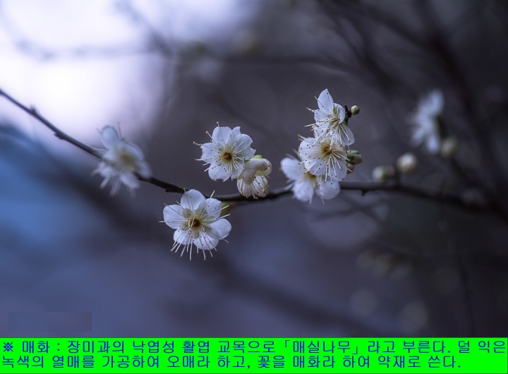 ※ 매화 : 장미과의 낙엽성 활엽 교목으로「매실나무」라고 부른다. 우리나라 중부지방 이남의 마을 부근에서 유실수로 재배하거나 관상수로 심는다. 나무껍질은 짙은 회색으로 불규칙하게 갈라진다. 어린 가지는 녹색으로 잎은 어긋나는데 계란형으로 끝이 길게 뾰족하고, 가장자리에 예리한 잔 톱니가 있다. 2~4월에 흰색, 연한 녹색, 홍색 등의 꽃이 잎보다 먼저 피고, 향기가 강하며, 6~7월에 둥근 모양의 열매가 노란색으로 익으며, 신맛이 난다. 홑꽃과 겹꽃이 있고, 여러 재배품종이 있으며, 열매는 식용과 음료용으로 쓰고, 한방에서 덜 익은 녹색의 열매를 가공하여「오매(烏梅)」라 하고, 꽃을「매화(梅花)」라 하여 약재로 쓴다.